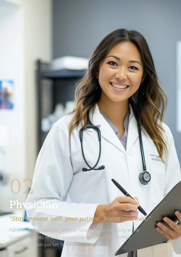 "The multilingual transcription is a game-changer. Half my patients speak Mandarin, half speak English. Scriben handles both seamlessly." — Attribution: — Physician, San Francisco
