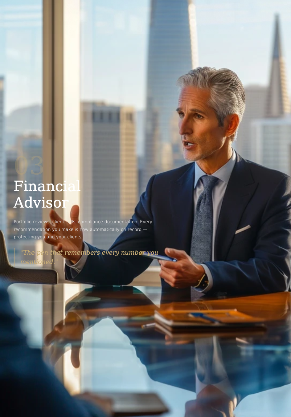 "Finally, an AI tool that doesn't require me to explain it to everyone in the room." — Attribution: — Financial Advisor, Chicago
